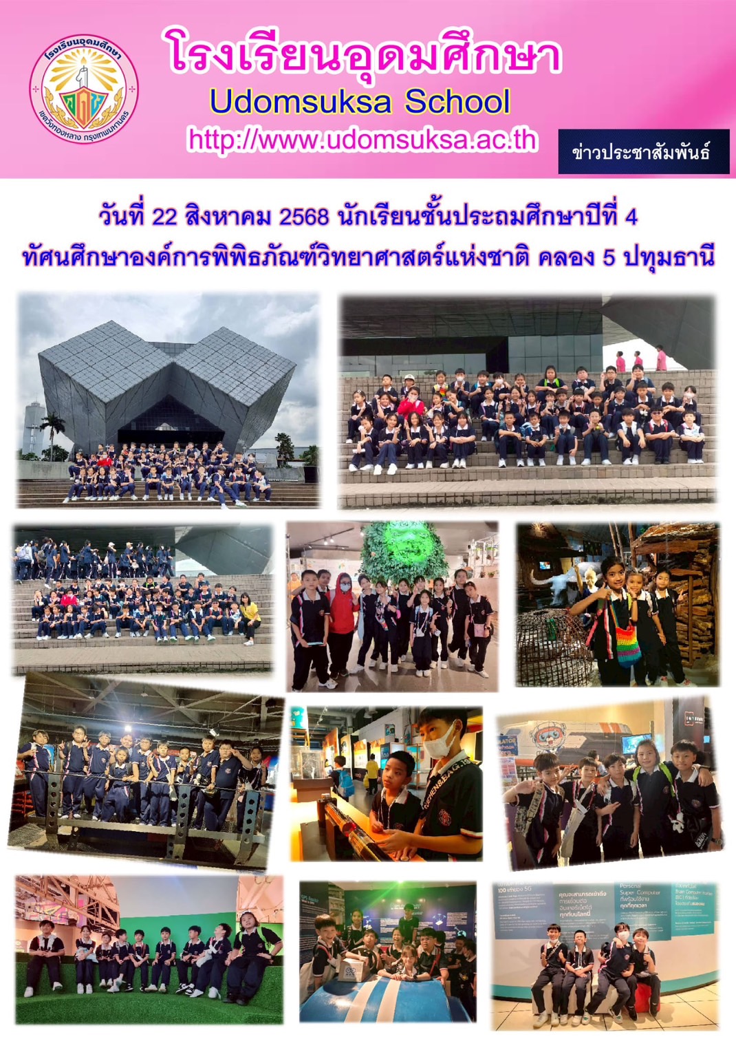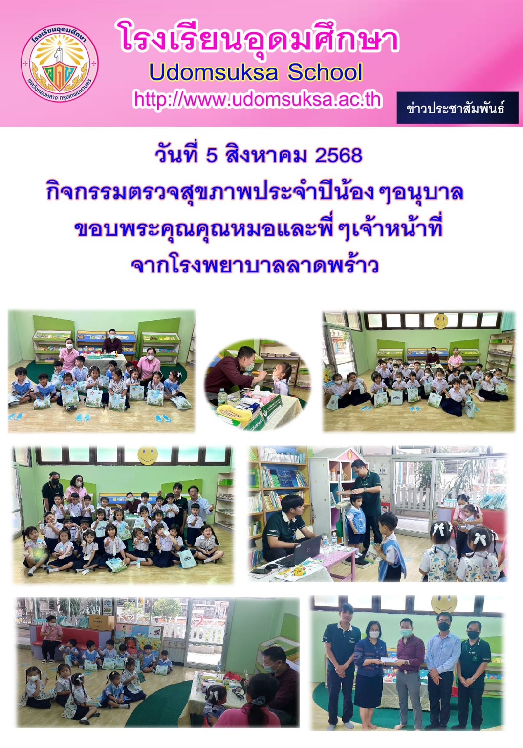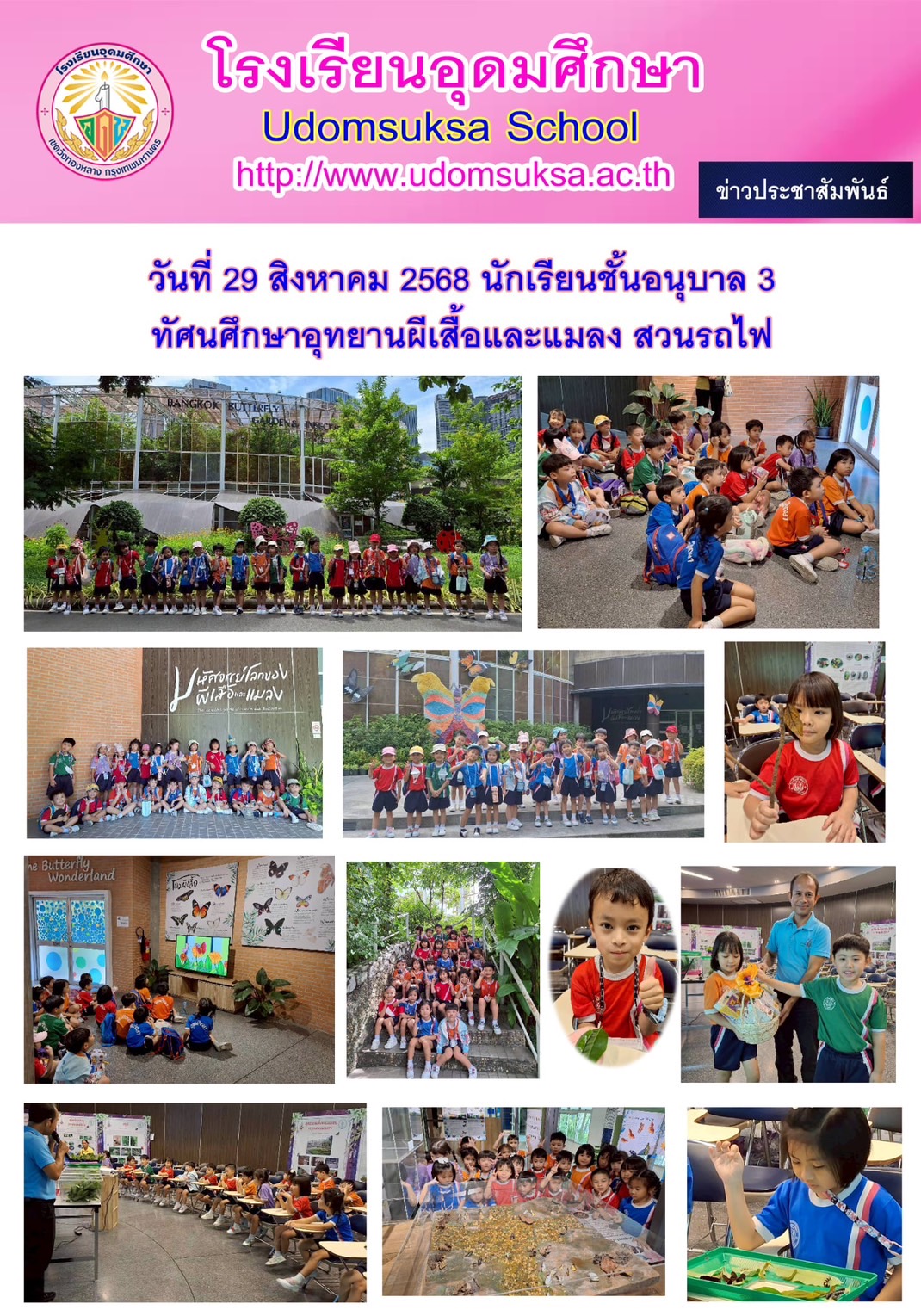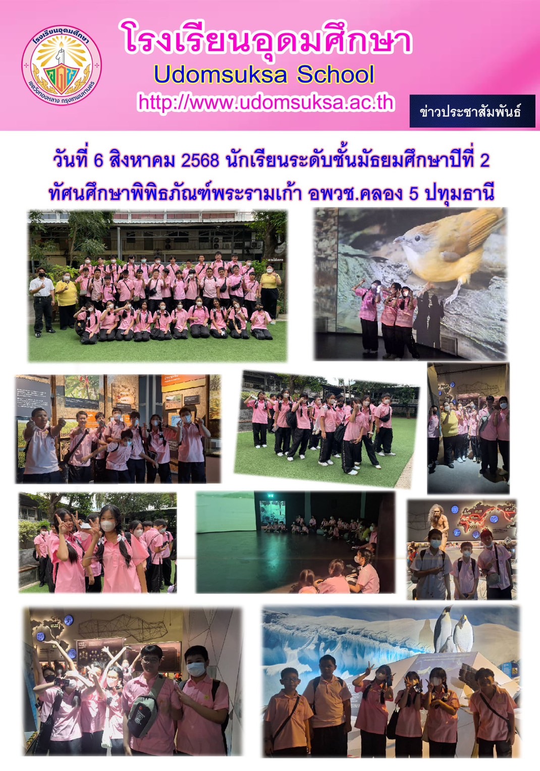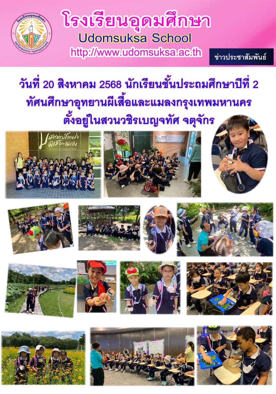 กิจกรรมประจำปีการศึกษา 2568 นักเรียนชั้นอ.3 ทัศนศึกษา ณ อุทยานผีเสื้อและแมลง : 29 ส.ค. 68 นักเรียนชั้นม.6 ทัศนศึกษา ณ พิพิธภัณฑสถานแห่งชาติ พระนคร : 26 ส.ค. 68 นักเรียนชั้นม.3 ทัศนศึกษา ณ พิพิธภัณฑสถานแห่งชาติธรณีวิทยาเฉลิมพระเกียรติ : 26 ส.ค. 68 นักเรียนชั้นป.4 ทัศนศึกษา ณ พิพิธภัณฑ์วิทยาศาสตร์ คลองห้า : 22 ส.ค. 68 นักเรียนชั้นป.6 ทัศนศึกษา ณ ศูนย์ส่งเสริมและพัฒนาเรียนรู้ทางวิทยาศาสตร์ (ท้องฟ้าจำลอง กรุงเทพ) : 21 ส.ค. 68 นักเรียนชั้นป.2 ทัศนศึกษา ณ อุทยานผีเสื้อและแมลง กรุงเทพมหานคร : 20 ส.ค. 68 นักเรียนชั้นป.3 ทัศนศึกษา ณ พิพิธภัณฑ์สแตมป์ไทย : 15 ส.ค. 68 นักเรียนชั้นป.5 ทัศนศึกษา ณ อนุสรณ์สถานแห่งชาติ : 14 ส.ค. 68 นักเรียนชั้นม.1 ทัศนศึกษา ณ พิพิธภัณฑ์วิทยาศาสตร์ คลองห้า : 13 ส.ค. 68 วันเฉลิมพระชนมพรรษา สมเด็จพระนางเจ้าสิริกิติ์ฯ : 8 ส.ค. 68 นักเรียนชั้นม.2 ทัศนศึกษา ณ พิพิธภัณฑ์พระราม ๙ : 6 ส.ค. 68 นักเรียนชั้นม.5 ทัศนศึกษา ณ ศูนย์การเรียนรู้ กฟผ. สำนักงานกลาง : 5 ส.ค. 68 วันตรวจสุขภาพประจำปีระดับอนุบาล : 5 ส.ค. 68 วันภาษาไทยแห่งชาติ : 25 ก.ค. 68 วันเฉลิมพระชนมพรรษา รัชกาลที่ 10 ณ สำนักงานเขตวังทองหลาง : 25 ก.ค. 68 วันเฉลิมพระชนมพรรษา รัชกาลที่ 10 : 25 ก.ค. 68 นักศึกษาวิชาทหารร่วมกิจกรรม "เราทำความดี ด้วยหัวใจ" : 16 ก.ค. 68 วันอาสาฬหบูชาและวันเข้าพรรษา ณ วัดสามัคคีธรรม : 9 ก.ค. 68 วันอาสาฬหบูชาและวันเข้าพรรษา ณ วัดพระราม 9 กาญจนาภิเษก : 8 ก.ค. 68 วันอาสาฬหบูชาและวันเข้าพรรษา ณ วัดเทพลีลา : 8 ก.ค. 68 วันอาสาฬหบูชาและวันเข้าพรรษา : 8 ก.ค. 68 วันสถาปนาลูกเสือไทย : 1 ก.ค. 68 วันสุนทรภู่ : 26 มิ.ย. 68 วันต่อต้านยาเสพติดโลก : 26 มิ.ย. 68 ประชุมคณะกรรมการบริหารโรงเรียน : 18 มิ.ย. 68 วันไหว้ครู : 12 มิ.ย. 68 วันเฉลิมพระชนมพรรษา สมเด็จพระนางเจ้าพระบรมราชินี ณ สำนักงานเขตวังทองหลาง: 30 พ.ค. 68 วันเฉลิมพระชนมพรรษา สมเด็จพระนางเจ้าพระบรมราชินี : 30 พ.ค. 68 ค่ายพุทธบุตร : 29-30 พ.ค. 68