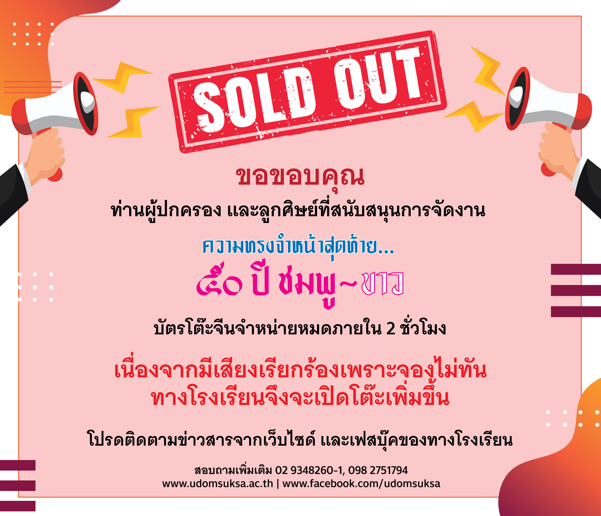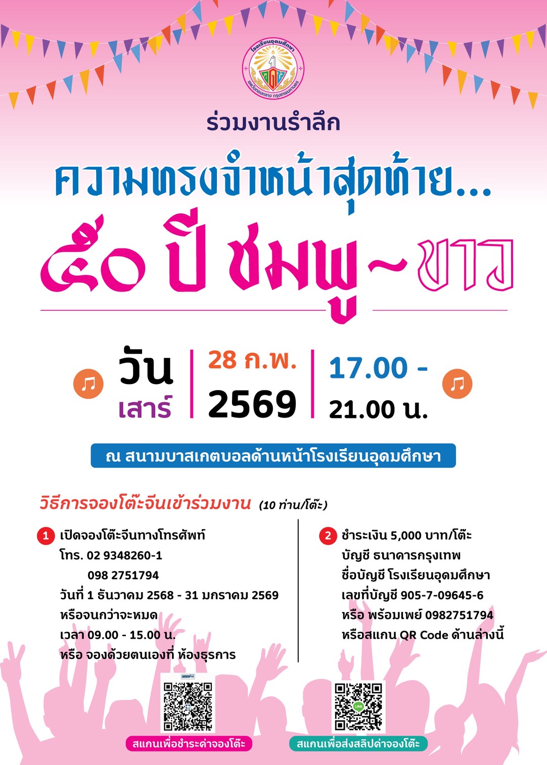 ในวันเสาร์ที่ 28 กุมภาพันธ์ 2569 ณ สนามบาสเกตบอลด้านหน้าโรงเรียนอุดมศึกษา เวลา 17.00 - 21.00 น. ตอนนี้โต๊ะถูกจองเต็มแล้ว รอประกาศเพิ่มเติมจากทางโรงเรียนสำหรับการจองโต๊ะรอบใหม่