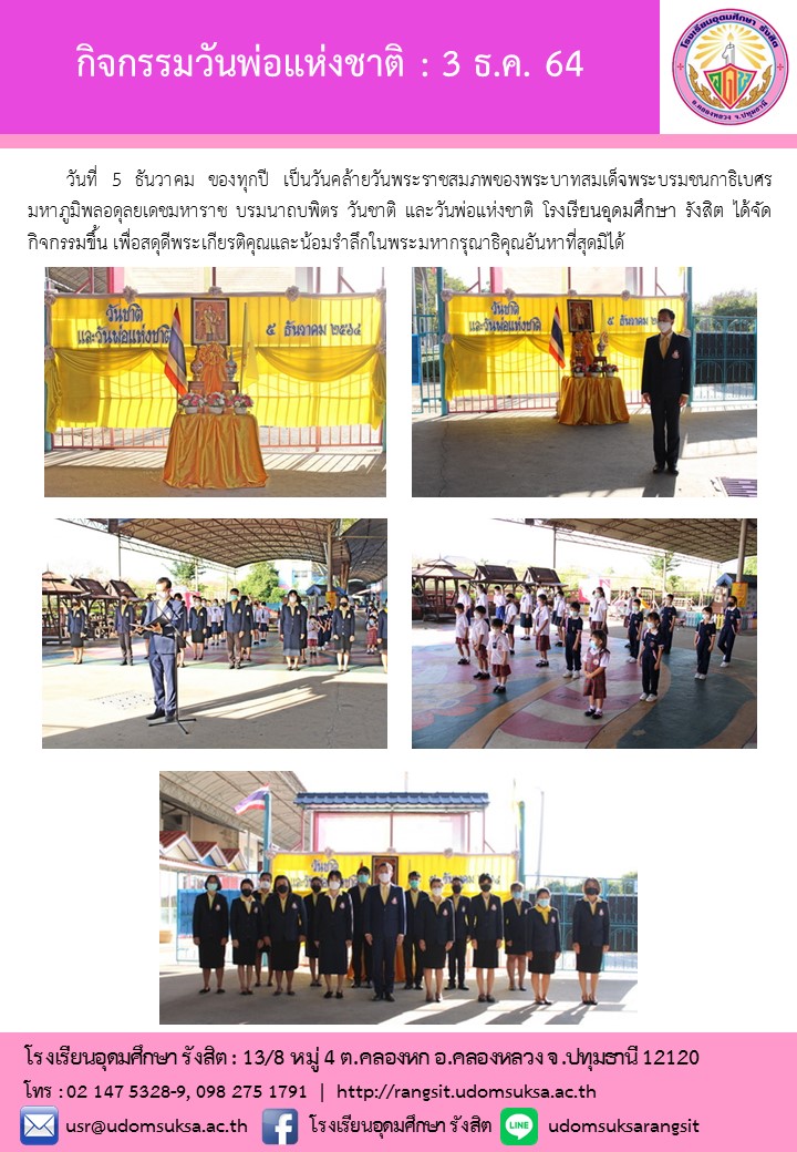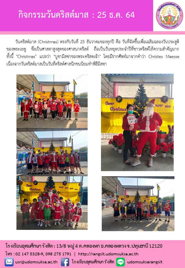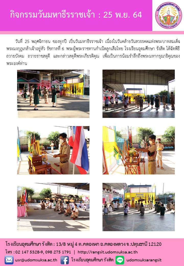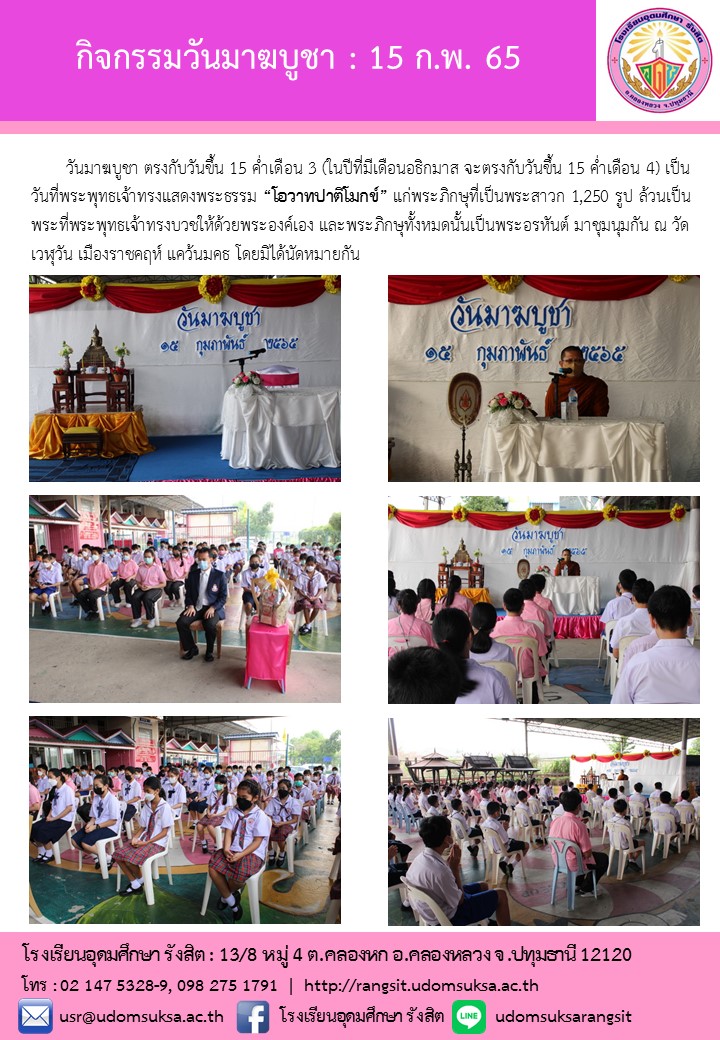 กิจกรรมประจำปีการศึกษา 2564 วันมาฆบูชา : 15 ก.พ. 65 วันตรุษจีน : 1 ก.พ. 65 ฉีดวัคซีนป้องกันบาดทะยัก : 26 ม.ค. 65 วันคริสต์มาส : 25 ธ.ค. 64 วันพ่อแห่งชาติ : 3 ธ.ค. 64 วันมหาธีรราชเจ้า : 25 พ.ย. 64 กิจกรรมปีการศึกษา 2566 | 2565 | 2564